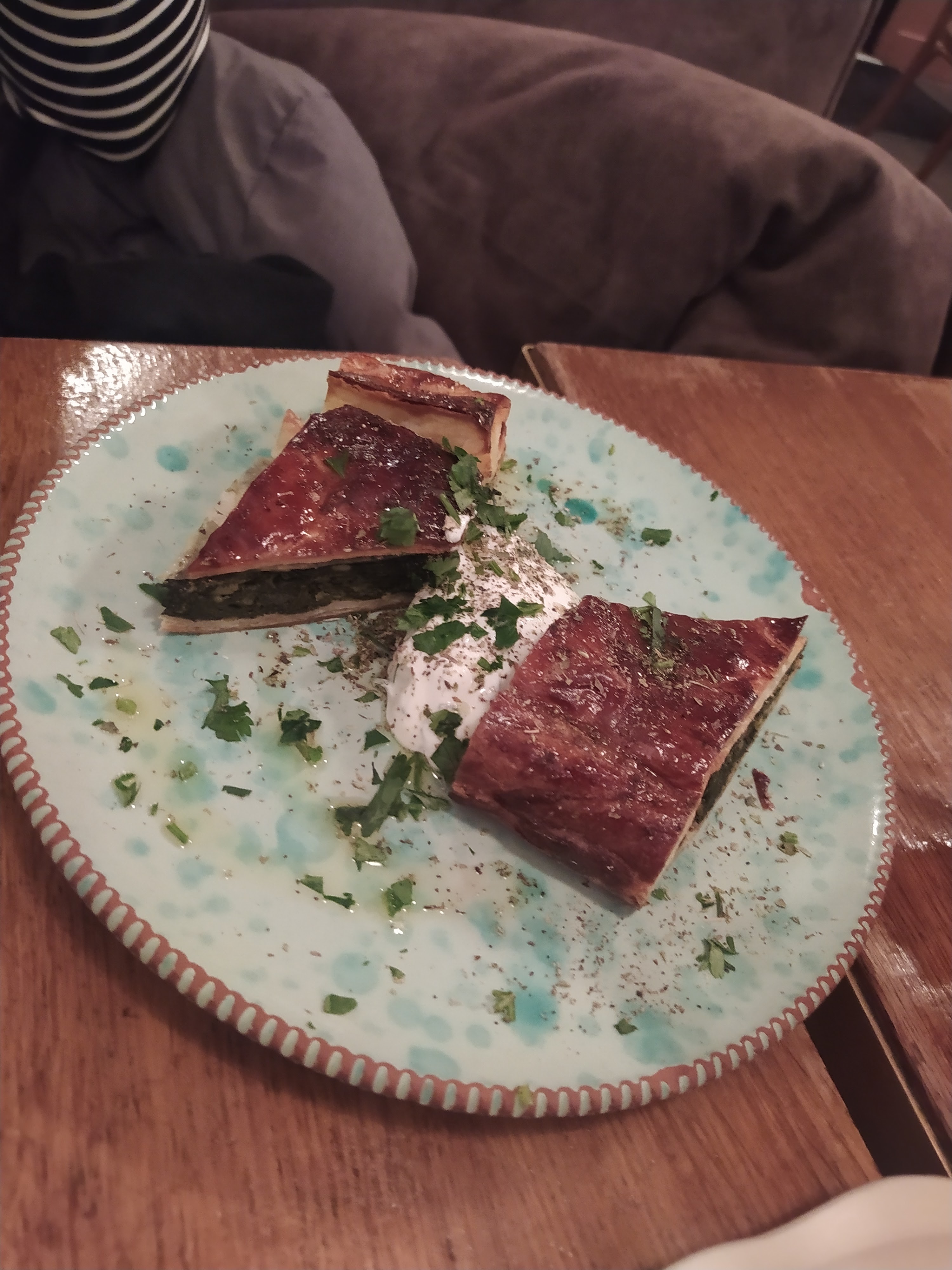 Souvlaki Keftediakia : très bonnes boulettes, très bonne sauce. Les frites à l'intérieur du sandwich, molles et imbibées de sauce, j'ai trouvé ça absurde. Le crumble pomme-framboises n'avait pas l'air de contenir de framboise 🤔 mais il était néanmoins délicieux, vraiment bon 👌. L'ambiance était moyenne, les membres du staff qui s'embrouillent devant les clients, c'est un peu malaisant 😅