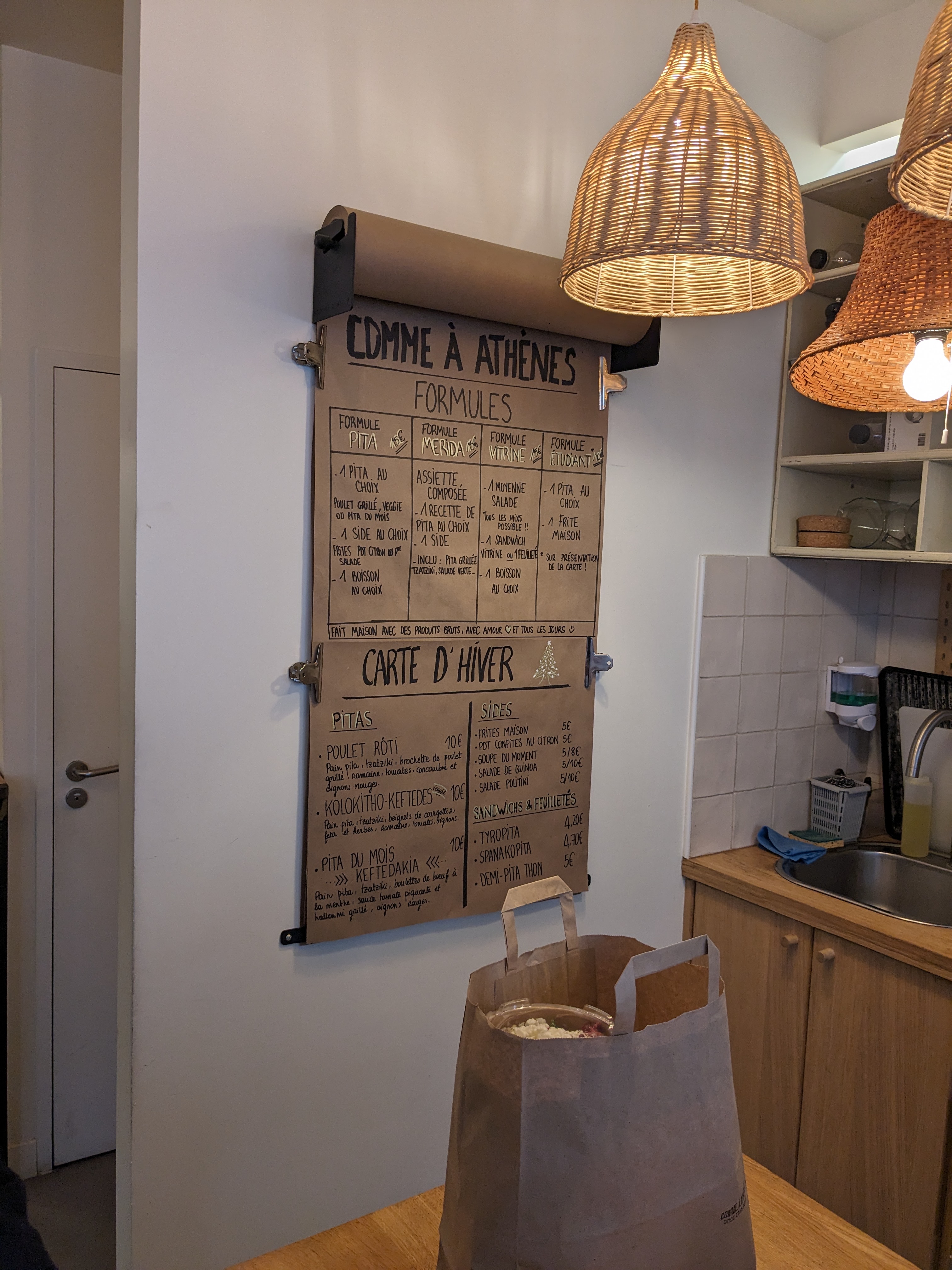 Une petite adresse au TOP pas très loin du Panthéon et des pubs du 5ème, que j'avais repéré sur instagram depuis un bon moment. On y mange quoi ? Des souvlaki (sortes de pita super bonne) garnies avec tout plein de trucs chouettes. Pour la team végé ça se passe avec des boulettes d'épinard ( des spanakopitas quoi), de la feta, et des herbes fraiches. Et c'est hyper bon ! En accompagnement tu peux choisir entre des frites maison (tuerie) ou des pommes de terres confites au citron (tuerie aussi), que tu peux ensuite manger avec de la sauce au yaourt maison. Vraiment, ça déchire. En bref : une bonne adresse si tu passes dans le coin, et que tu as envie de manger rapidement autre chose qu'un pita-falafel ou des makis concombre !