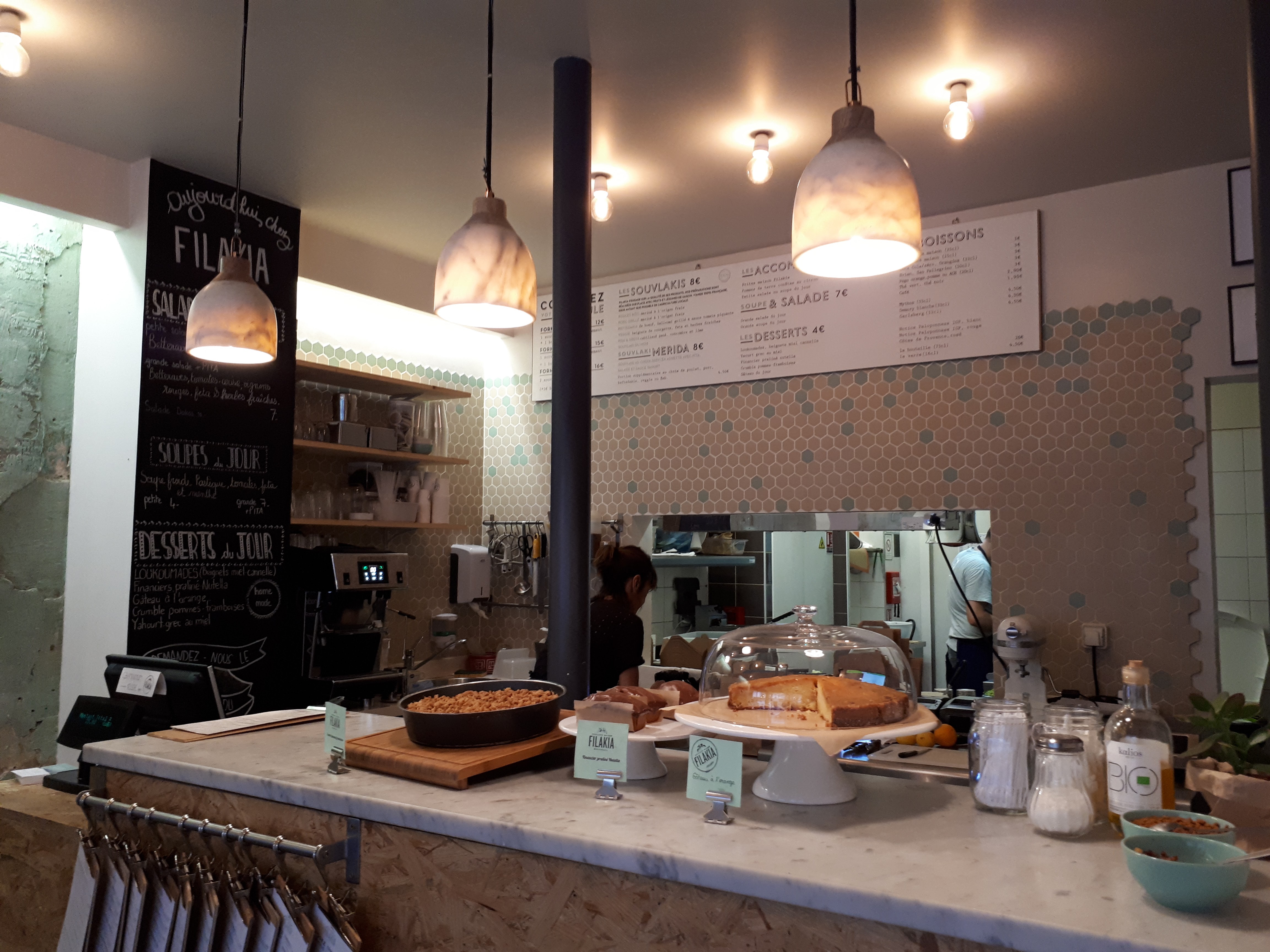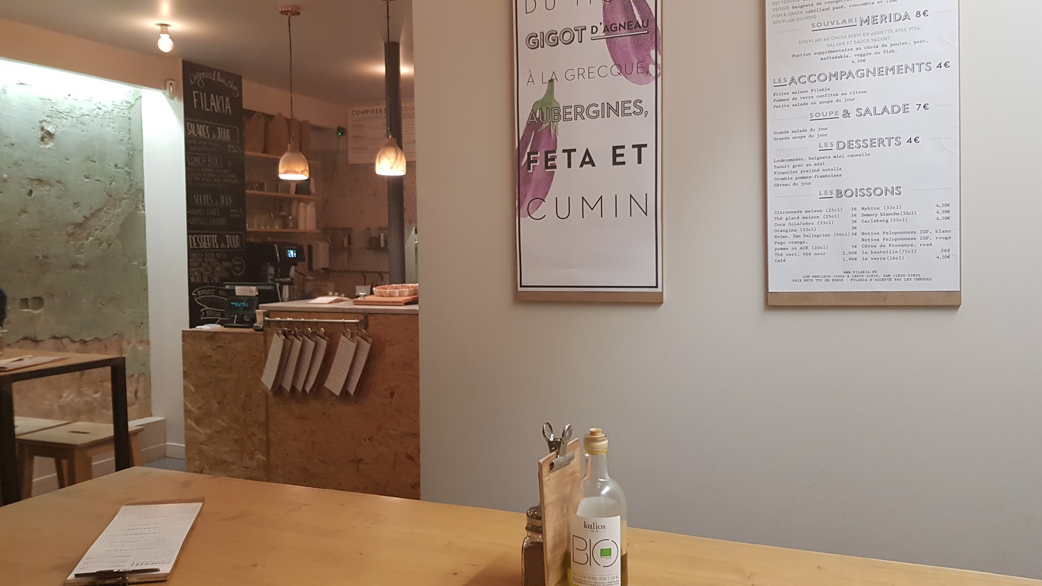 Juste en face de l'université de Jussieu, une des deux adresses de Filakia. Une adresse formidable de nourriture rapide mais avec des produits de qualité, une exigence dans la préparation. Les cuisiniers proviennent de formations de prestige. Un incontournable au rapport qualité prix exact. Le Filakia du mois est généralement très bon. Sur la table, les merveilleuses huiles grecques Kalios de la gastrosphère parisienne. Vraiment séduit.