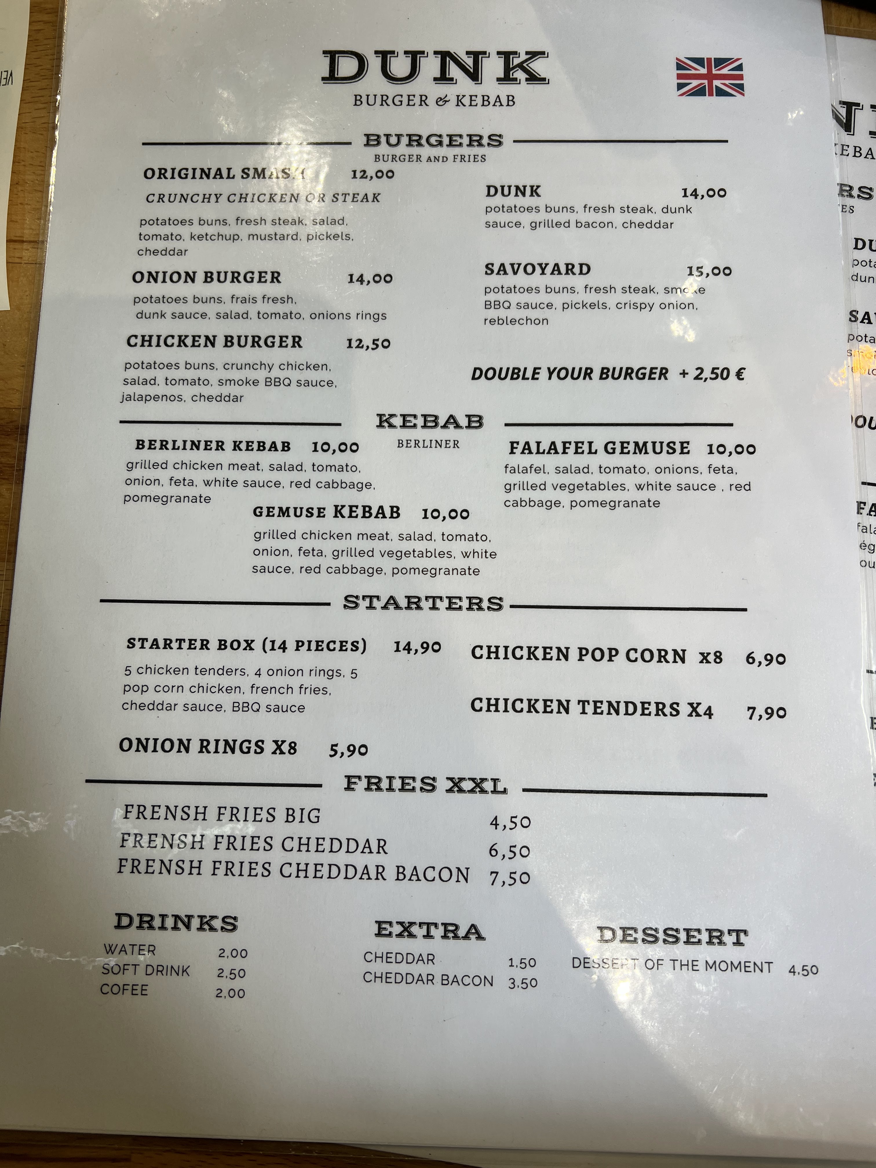 J'ai eu l'occasion de déguster un kebab chez Dunk et je dois dire que c'était l'une des meilleures expériences culinaires que j'ai eues. L'accueil était magnifique. Le kebab était délicieux, avec des saveurs authentiques et une viande tendre, et les frites étaient incroyablement bonnes, croustillantes à souhait. J'ai été impressionné par la qualité de la nourriture. Je recommande vivement Dunk à tous les amateurs de kebab et de frites. Une expérience à 5 étoiles, c'est sûr!