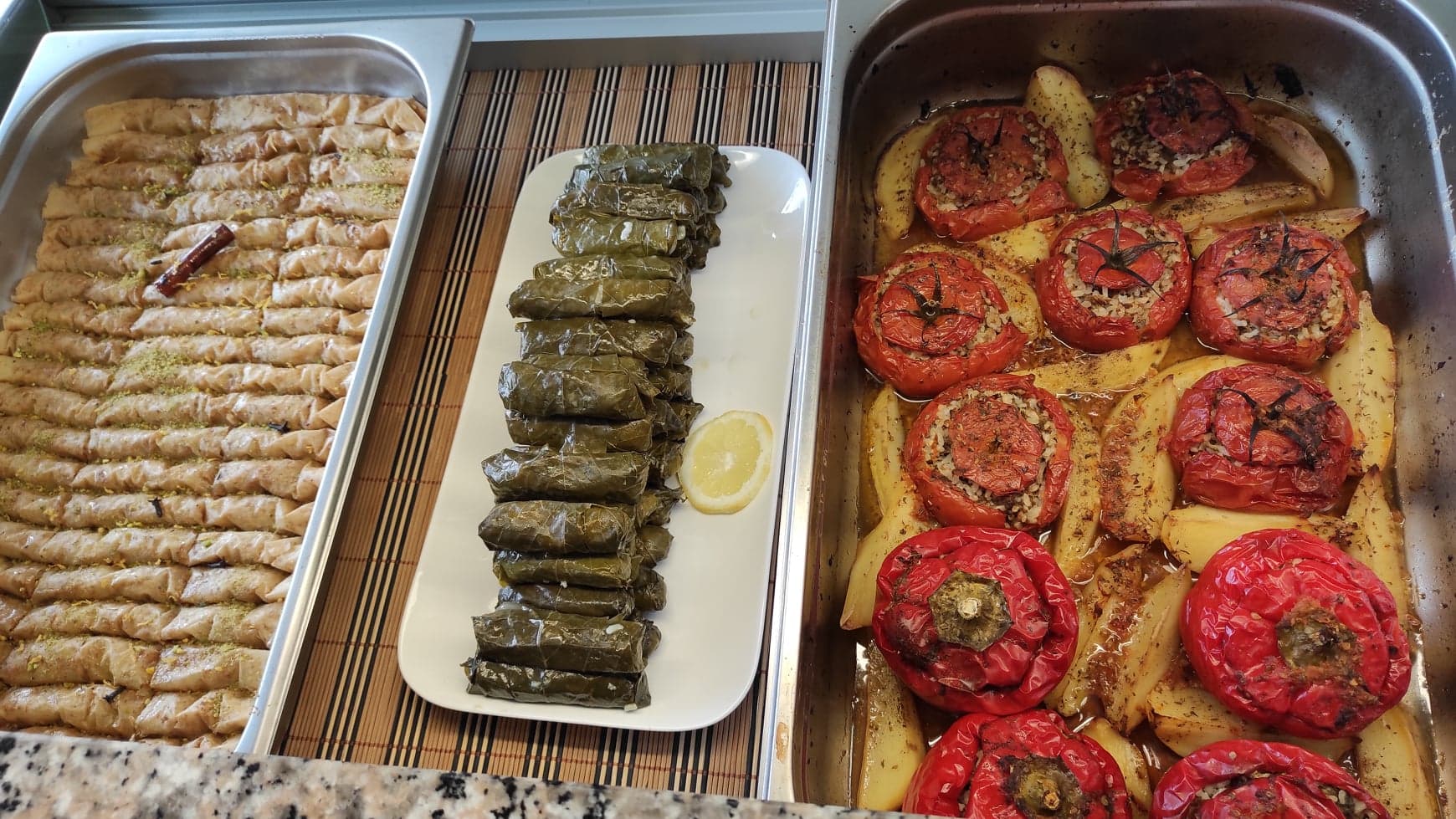 Nous avons presque tout goûté en salé et en sucré. Tout est délicieux. Les dolmades et le houmous sont excellents.