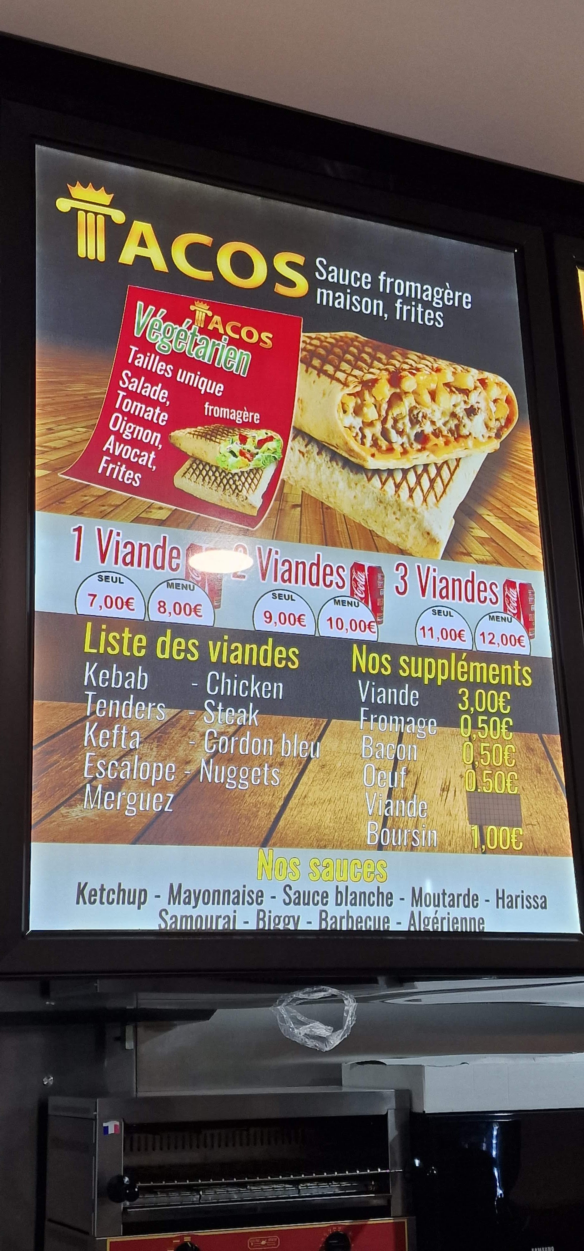C’est surtout le roi de la crevardise !! pitié arreter de me dire que les frites sont dans le tacos quand elles sont presentes sur toute l’affiche j’ai recus un plateau sans sauce sans frite pour 12 euros c’est vraiment triste