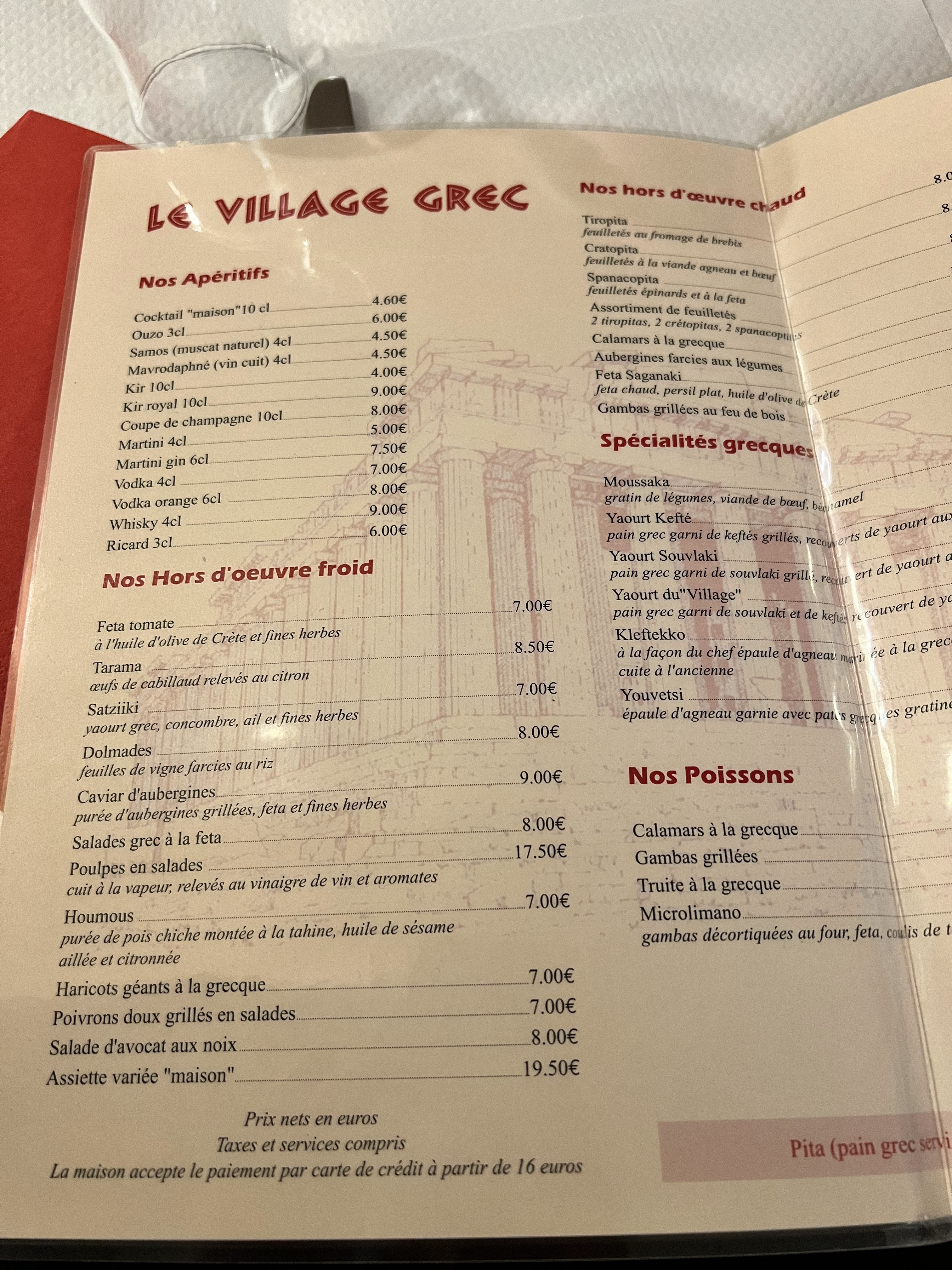 Toujours un immense plaisir de venir dîner au village Grec. Mes favoris : l'assiette variée (caviar d'aubergine à tomber!!) et le yaourt du village et le vin grec résina, mais tout est bon sur la carte. N'hésitez pas à demander conseils au patron qui est une crème! Cuisine de qualité.