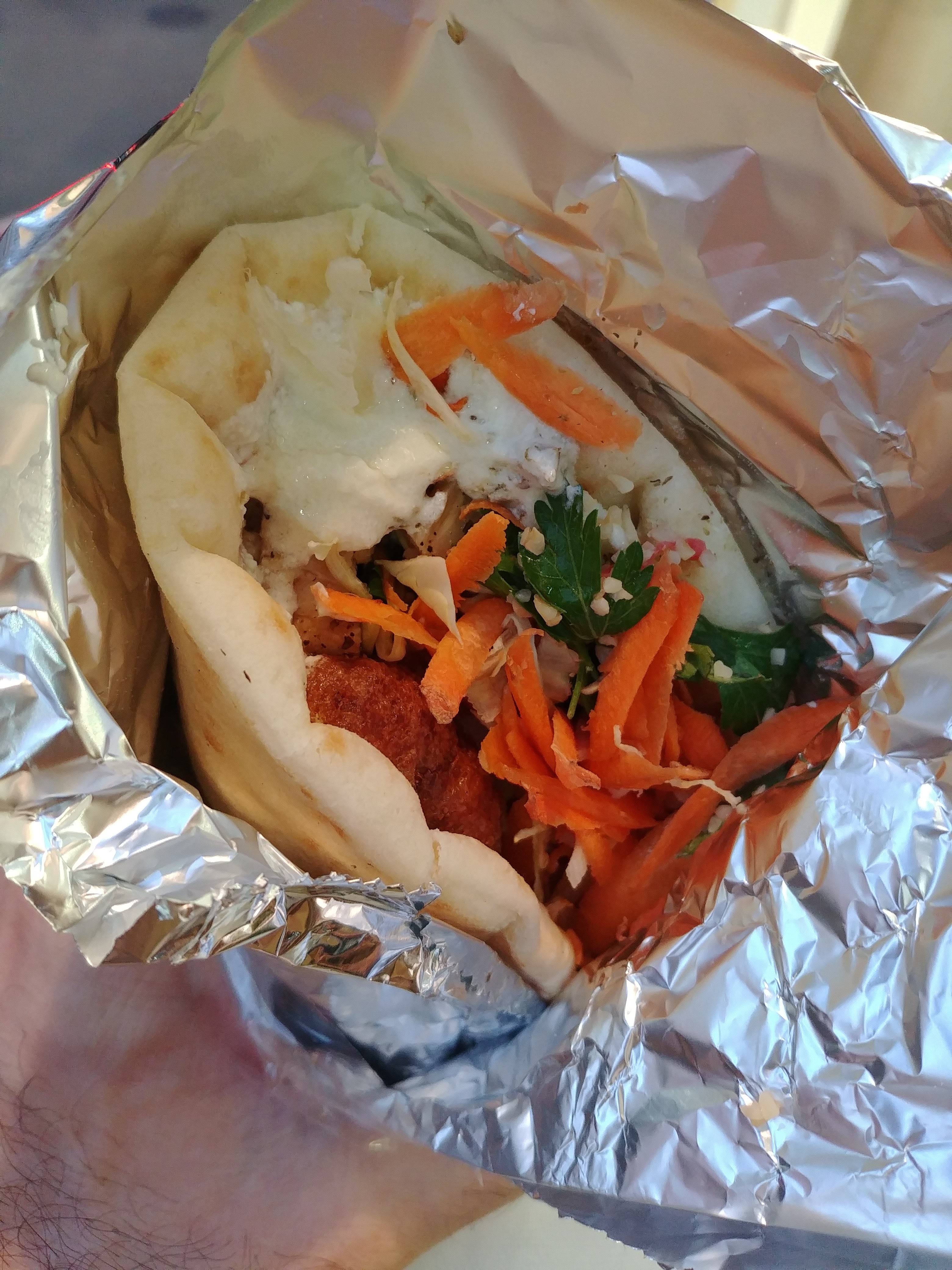 Incroyable sandwich végétarien avec boules d'aubergines et feta, sauce tzatiki incroyable, taboulé, légumes verts frais et huile d'olive. Sandwich énorme et copieux sur du pain pita très moelleux et frais à un prix très raisonnable. Je ne pourrais pas recommander davantage cet endroit !! Des gens vraiment sympas aussi.