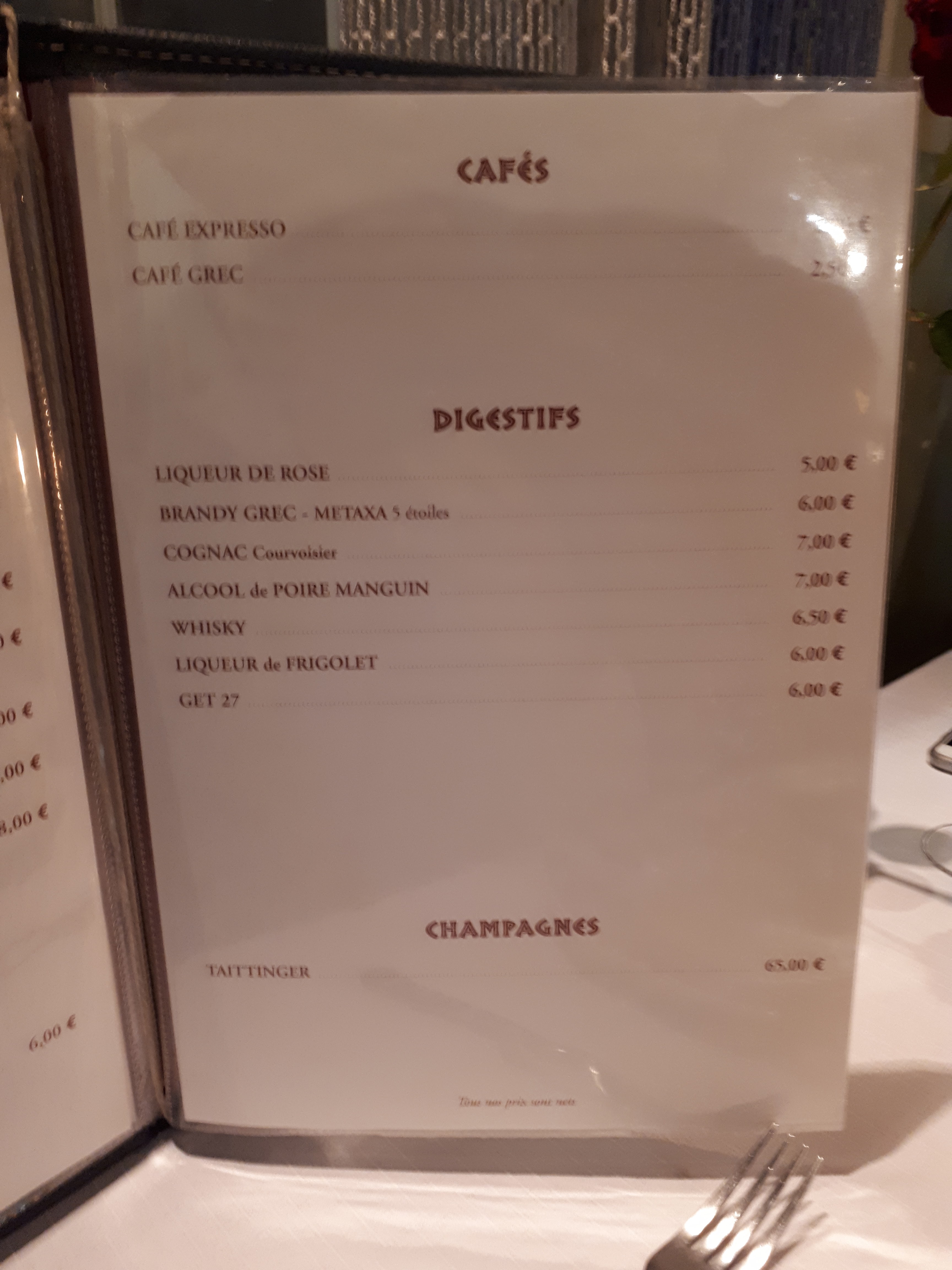 Le cadre est magnifique, un orgue en guise de cheminée, dès tableaux partout, la musique nous transporte dans les Cyclades... L accueil est très sympathique et discret. La cuisine est délicieuse, pour un budget très raisonnable, entre 40 et 50 euros par personne, pour les mezes, vin et café. Que dire de plus, si ce n'est félicitations au chef !!