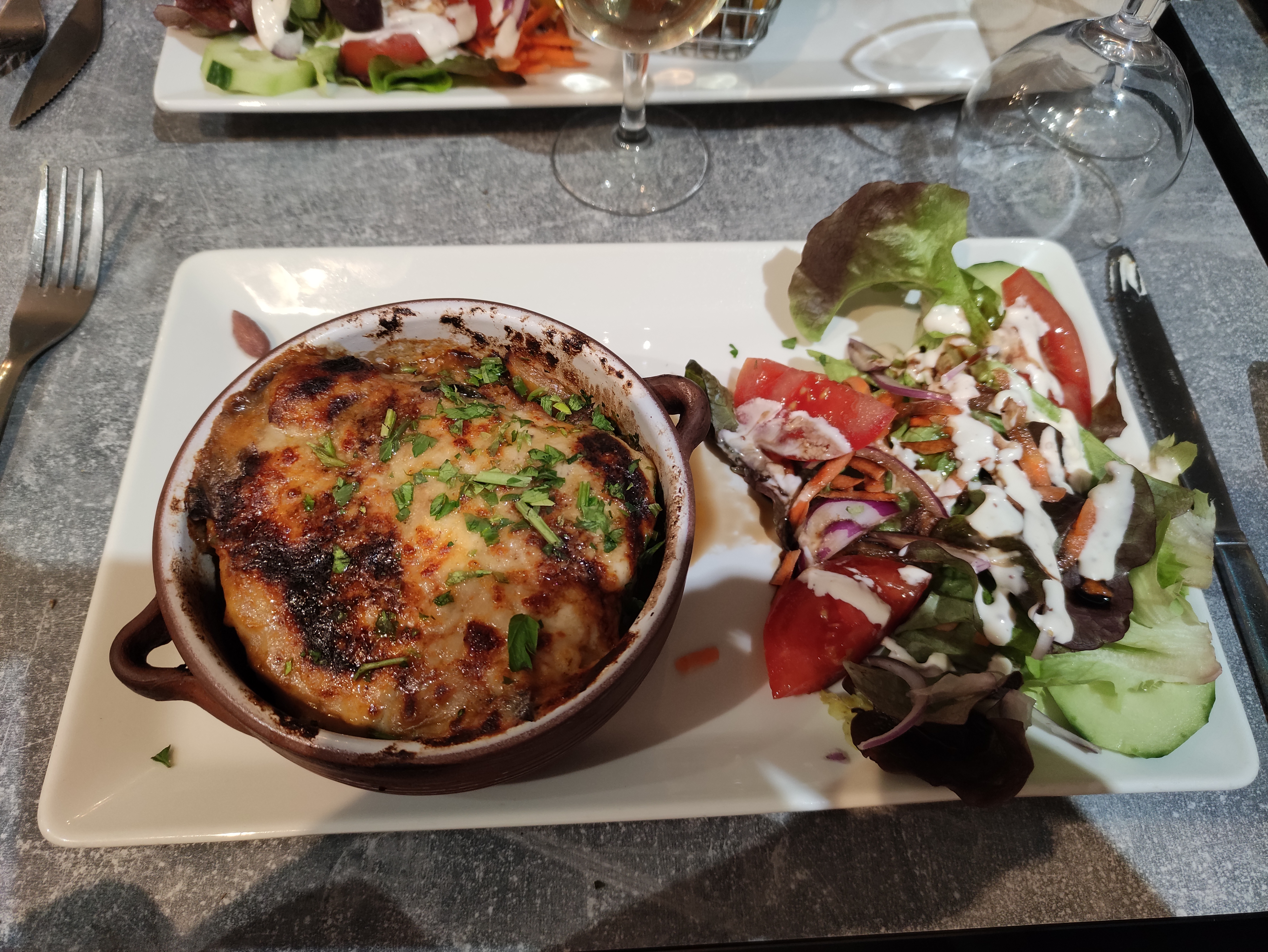 Vraiment décevant, nous y avons mangé sans doute le mauvais jour (24/10/21). 3/4 d'h d'attente, pour une moussaka aux pommes de terre ( très surprenant pour une spécialité Grecque), des brochettes au bœuf alors que j'avais commandé au porc ( ça c'est un détail) servies avec des frites surgelées pour 16€ .... Il est vrai que le personnel est très sympa . Donc on refera peut-être un autre essai en testant d'autres spécialités .... (La moussaka : Les variantes macédonienne, bulgare, serbe, bosniaque, monténégrine et roumaine sont préparées avec des pommes de terre ou des courgettes, et non des aubergines.)