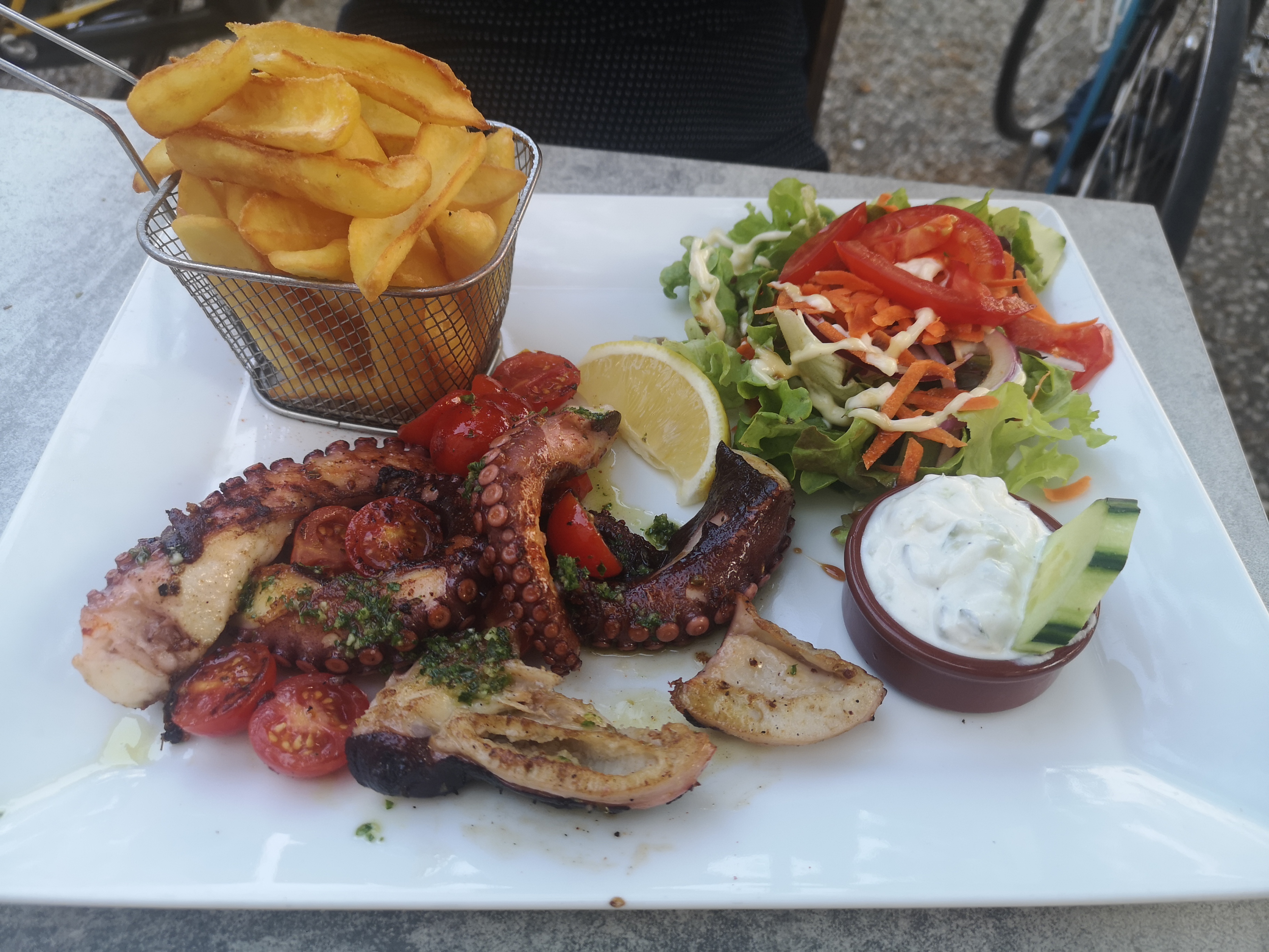Nous avons passé un très bon moment. Les serveuses efficaces et le repas délicieux. J'avais pris du poulpe, il était servi avec frites salade et une sauce genre yaourt, un bout de Grèce tout simplement.