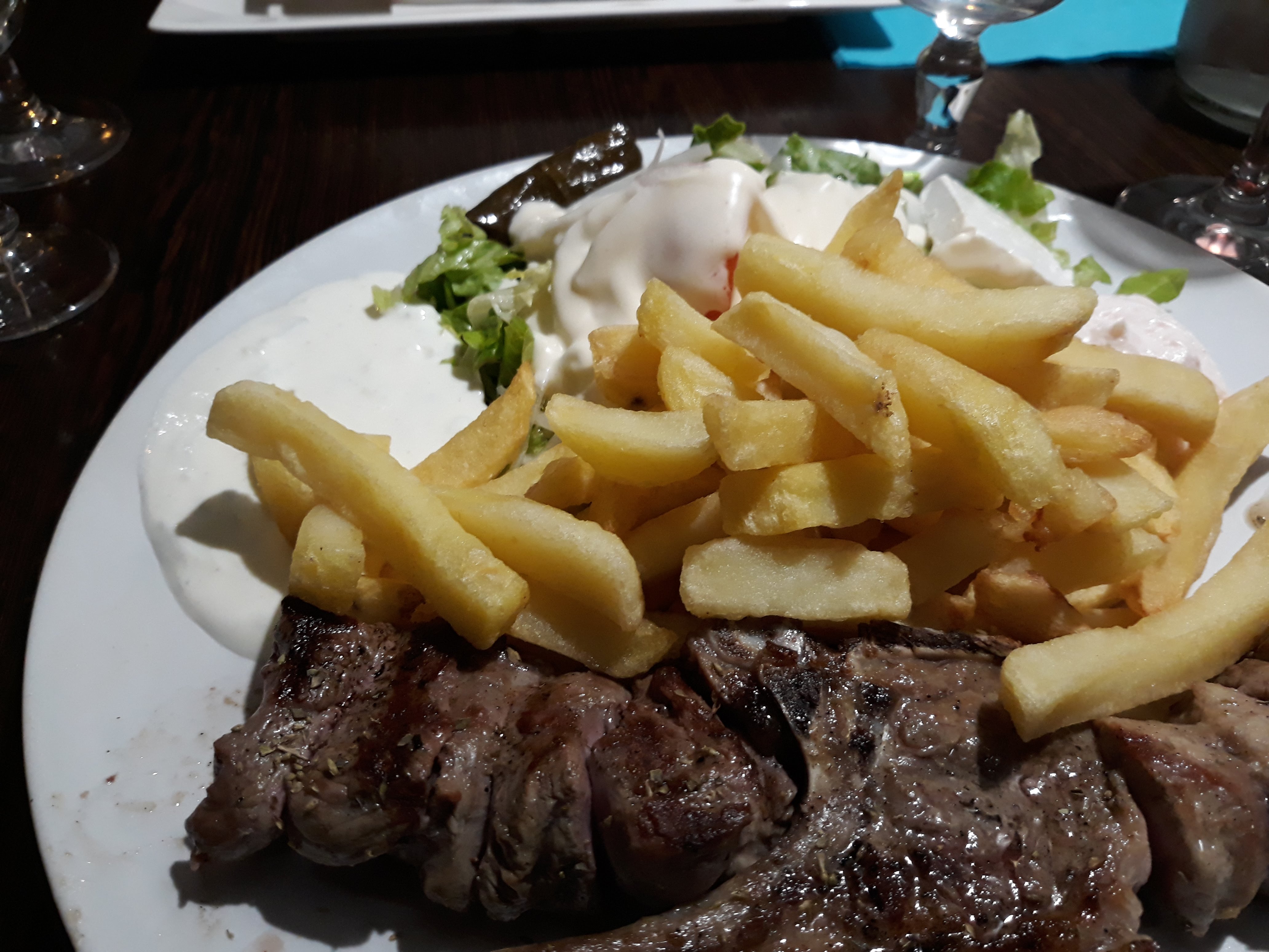 Le restaurant ne semble pas ou peu chauffer, une doudoune n'est pas de trop. La lumière à l'intérieur reste faible (plus de la moitié des ampoules non allumées), désagréable pour manger. Pour le plat, la viande est coupée en gros morceaux et il semble être préparé à l'avance, mise sous cloche > tiède voir froid à des endroits... En résumé, ce n'est pas le meilleur restaurant grec surtout pour le rapport qualité/prix.
