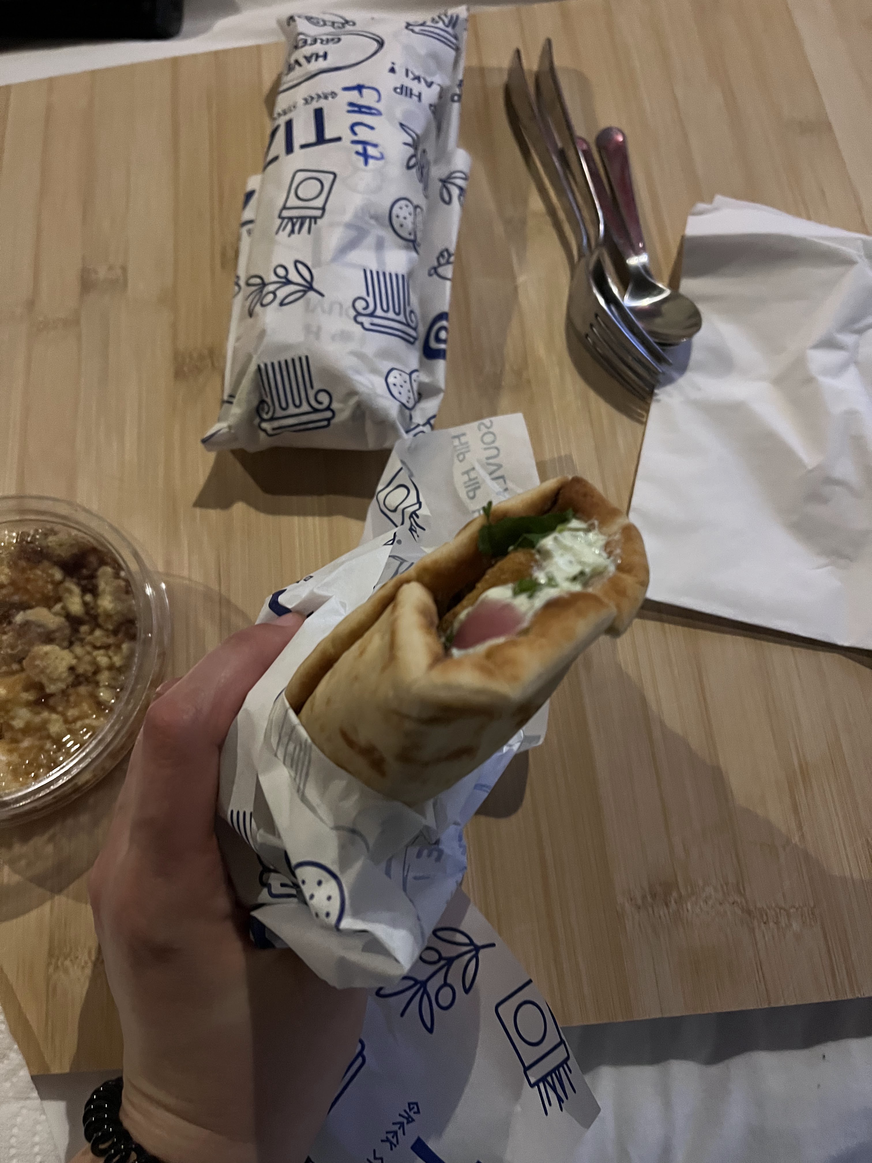 Nous sommes passés par là en nous promenant et nous avions déjà envie de cuisine grecque. C'était tellement délicieux, c'est dommage qu'on ne puisse pas trouver quelque chose comme ça aux Pays-Bas. Ce qui est dommage c'est qu'on ne peut pas y manger, mais j'espère qu'il y aura des places assises à l'avenir.